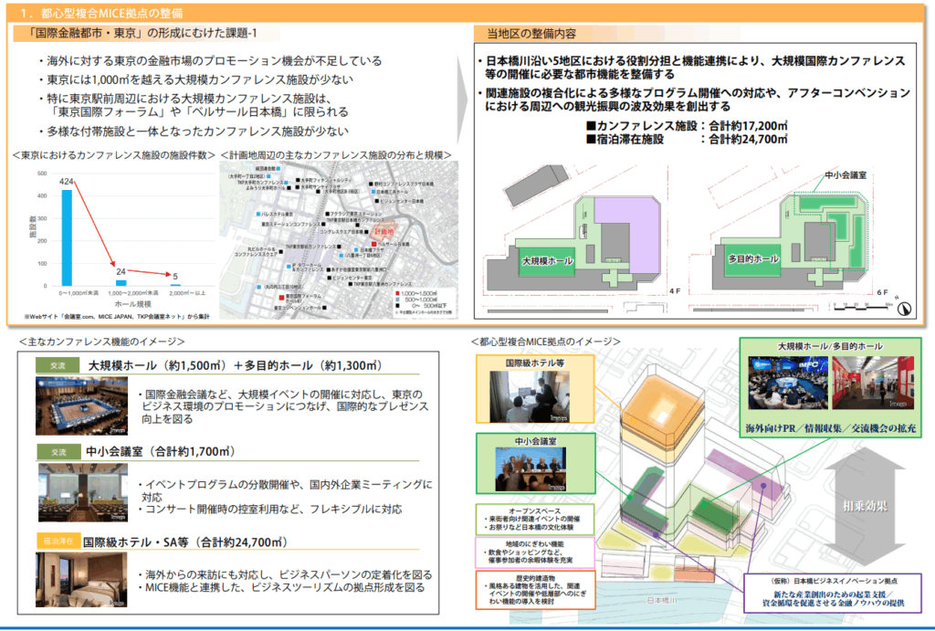 このプロジェクトは、オフィス、商業施設、ホテル、居住施設、MICE施設、ビジネス支援施設などの多様な機能を一つの建物に集約した複合施設です。地下1階から4階には、あらゆる来街者の思いに応えるコンテンツを備える商業ゾーンを形成し、日本橋エリアの賑わい創出に貢献します。
